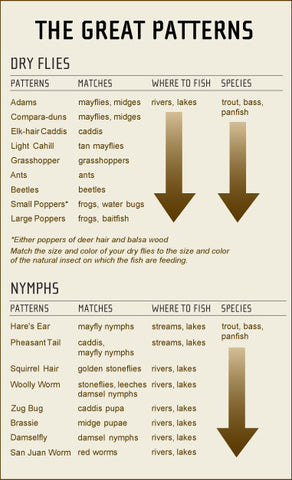 Die folgende Tabelle zeigt die verschiedenen Muster, die zum Süßwasserfischen verwendet werden können, z. B. Panfish, Barsch und Forelle. Manchmal kann es schwierig sein, den passenden Bruttyp zu finden, da Süßwasserfische nur eine genaue Nachahmung eines im Wasser vorkommenden Insekts annehmen. Diese Fliegen können oft die meisten Fische fangen.