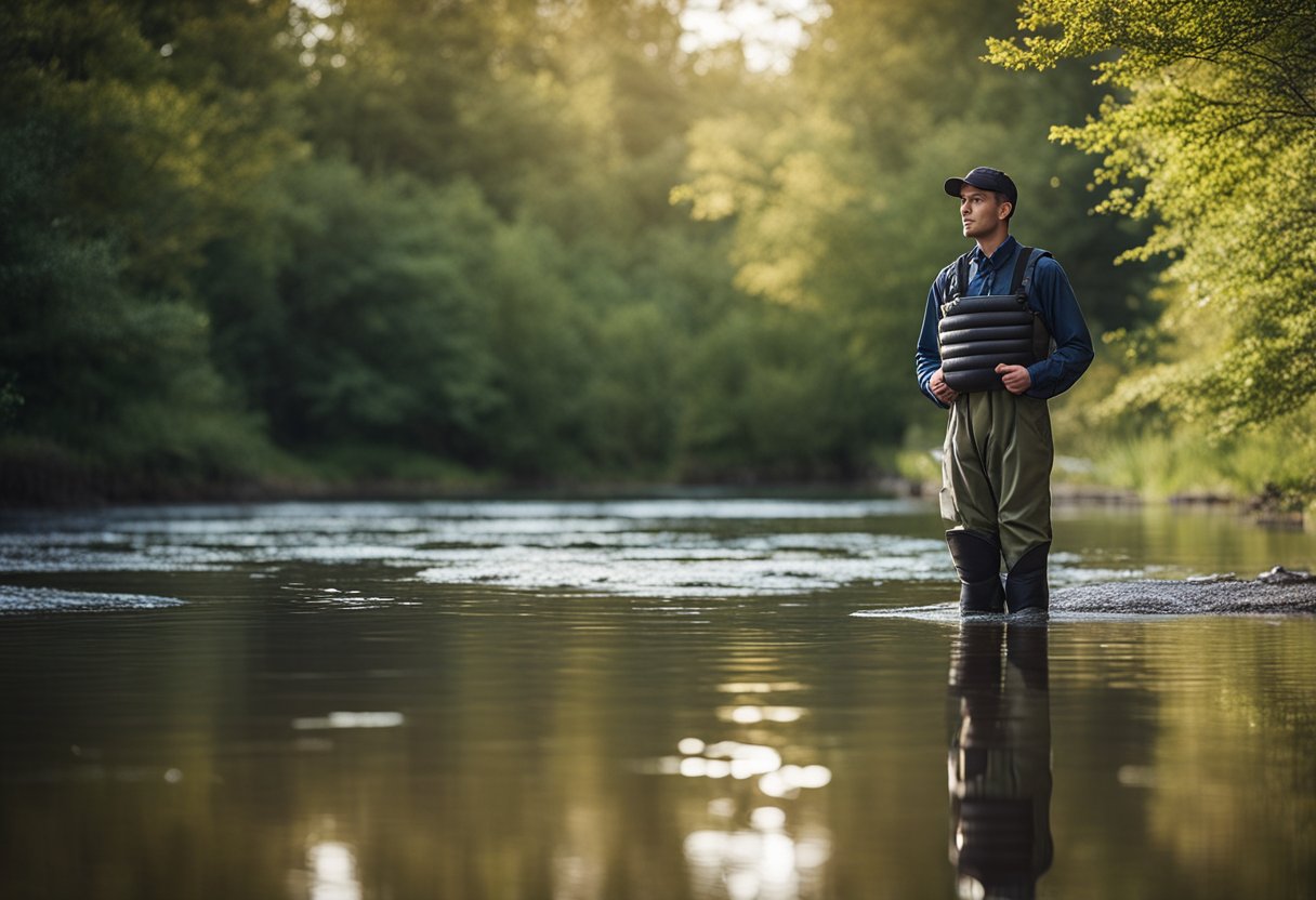 A fisherman wearing durable hip waders stands in a shallow river, surrounded by lush greenery and gently flowing water