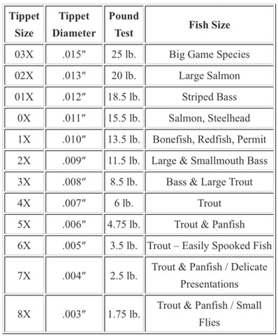 Para ajudar os pescadores com suas linhas cônicas, os fabricantes desenvolveram um sistema de classificação X. Isso os ajuda a escolher o tamanho certo do tippet com base no tipo de peixe que desejam. Existem vários tamanhos de tippet à sua escolha, como o forte e rígido 03X, o leve e o fino 8X.